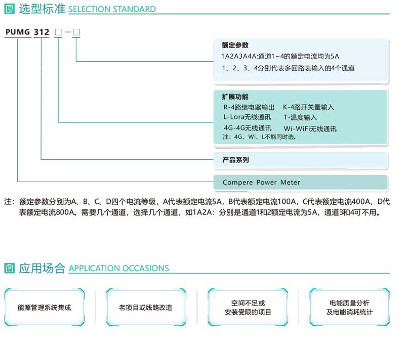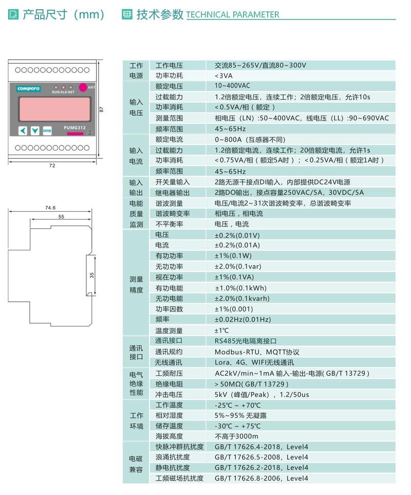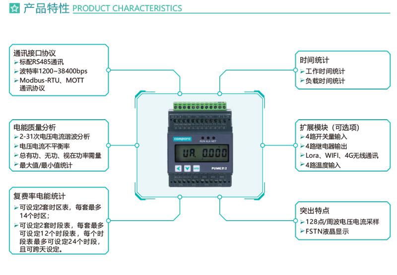 PUMG312系列三相导轨式智能电力能效终端采用DIN35mm 导轨式安装结构和LCD液晶屏显示,可测4个三相回路的电参量、2~31次谐波、统计运行时间等,标配1路RS485通讯接口,可通过Modbus -RTU或MQTT通讯协议实现仪表的网络化管理。还可扩展4路开关量输入和4路继电器输出,外接开口式互感器易于改造项目的施工。PUMG312具有体积小巧,精度高,可靠性好,安装方便等优点,多用于系统集成.