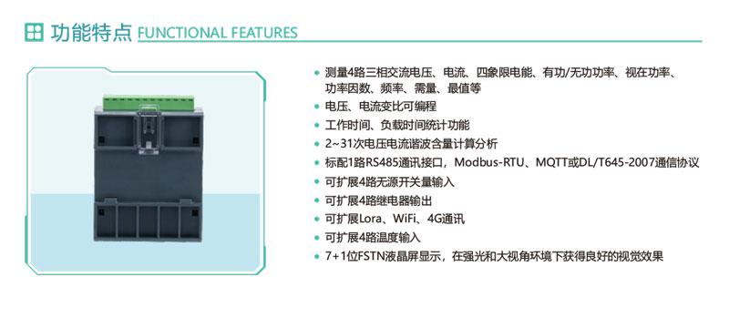 1.测量4路三相交流电压、电流、四象限电能、有功/无功功率、视在功率、