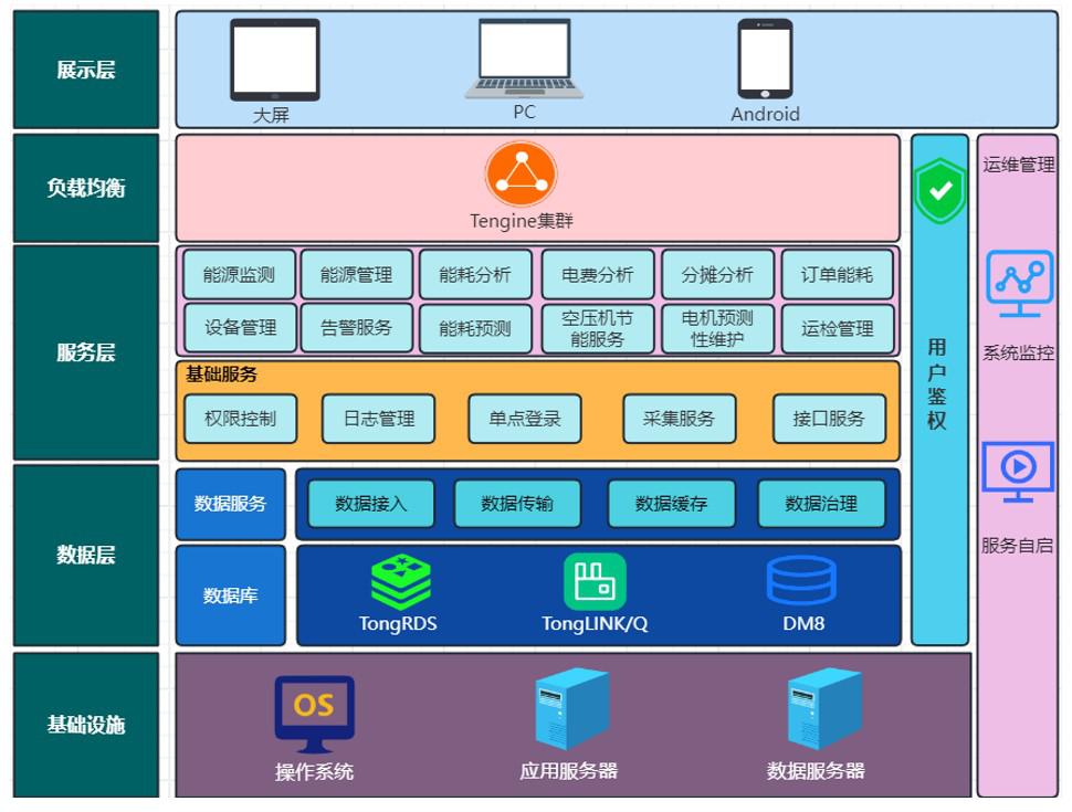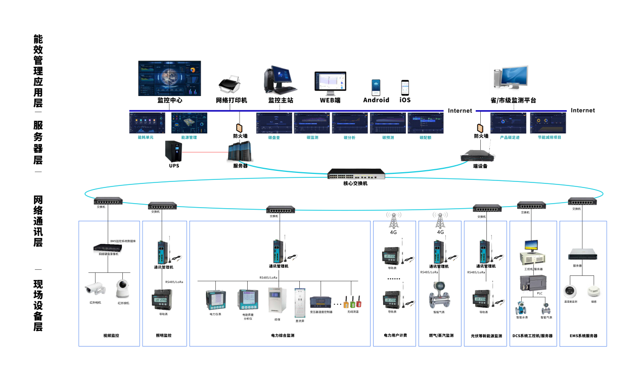 系统面向终端用户提供能碳管理业务的核心功能层,基于服务器层处理后的数据,结合国家标准与企业管理需求,可通过监控大屏、工作站、移动终端等设备提供多样化的能碳管理应用展示和管理功能。