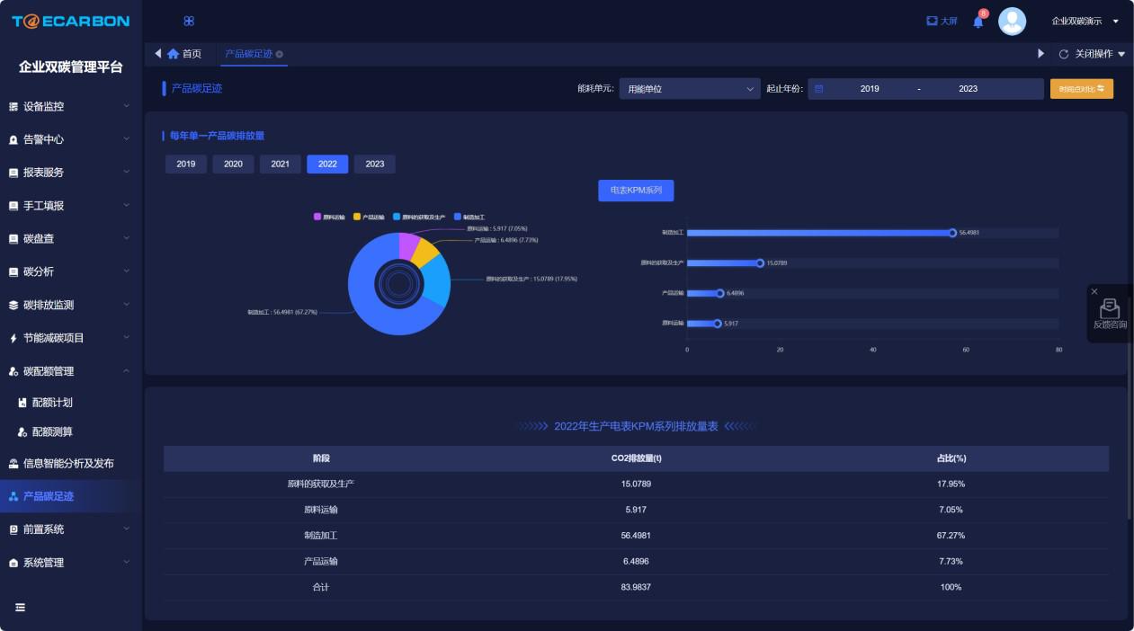 展示企业各个产品不同时间段的碳排放量以及每个产品各个阶段的碳排放量。通过数字化、可视化的方式展示企业产品碳足迹,从而协助企业进行产品碳足迹认证工作。