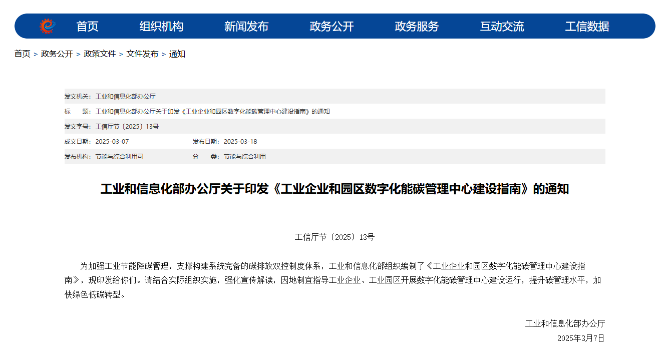 工业和信息化部于2025年3月正式印发《工业企业和园区数字化能碳管理中心建设指南》(工信厅节〔2025〕13号),为能碳管理系统的建设提供了国家标准指导。