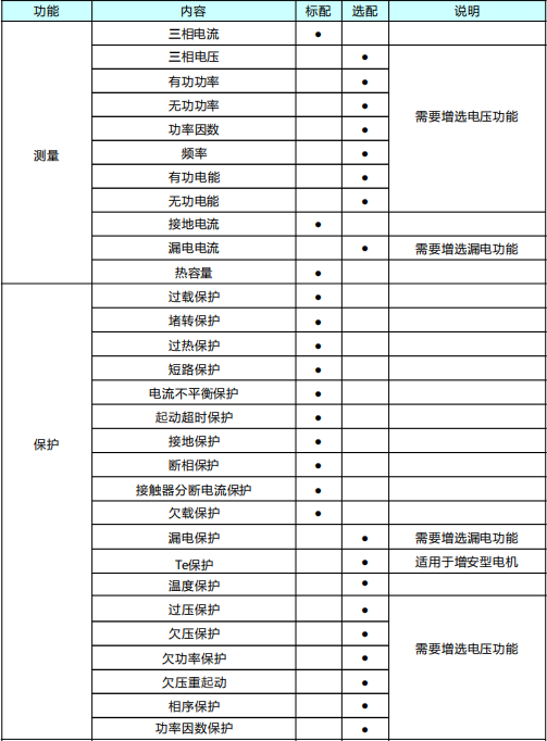 由于电动机应用的用途、性能、环境,因此电动机保护的功能种类和数量也有所差异。所以用户在选择电动机保护器功能时,可能在选择保护功能时不尽相同。因此,云顶国际从用户的角度出发,避免在电动机保护器选型上的不便以及购买非必要功能造成的额外支出,云顶国际编排了一个标准的电动机保护器的选型。
