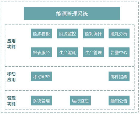 能源管理系统是一个能源管理工具及方案的统称,它的表征是操作系统软件,实际上是一个整体能源管理方案的集合体现。因此,不同的厂家对于能源管理系统的解读是不同的,但能源管理系统的应用功能上是集中于应用功能、移动应用、管理功能三大模块。