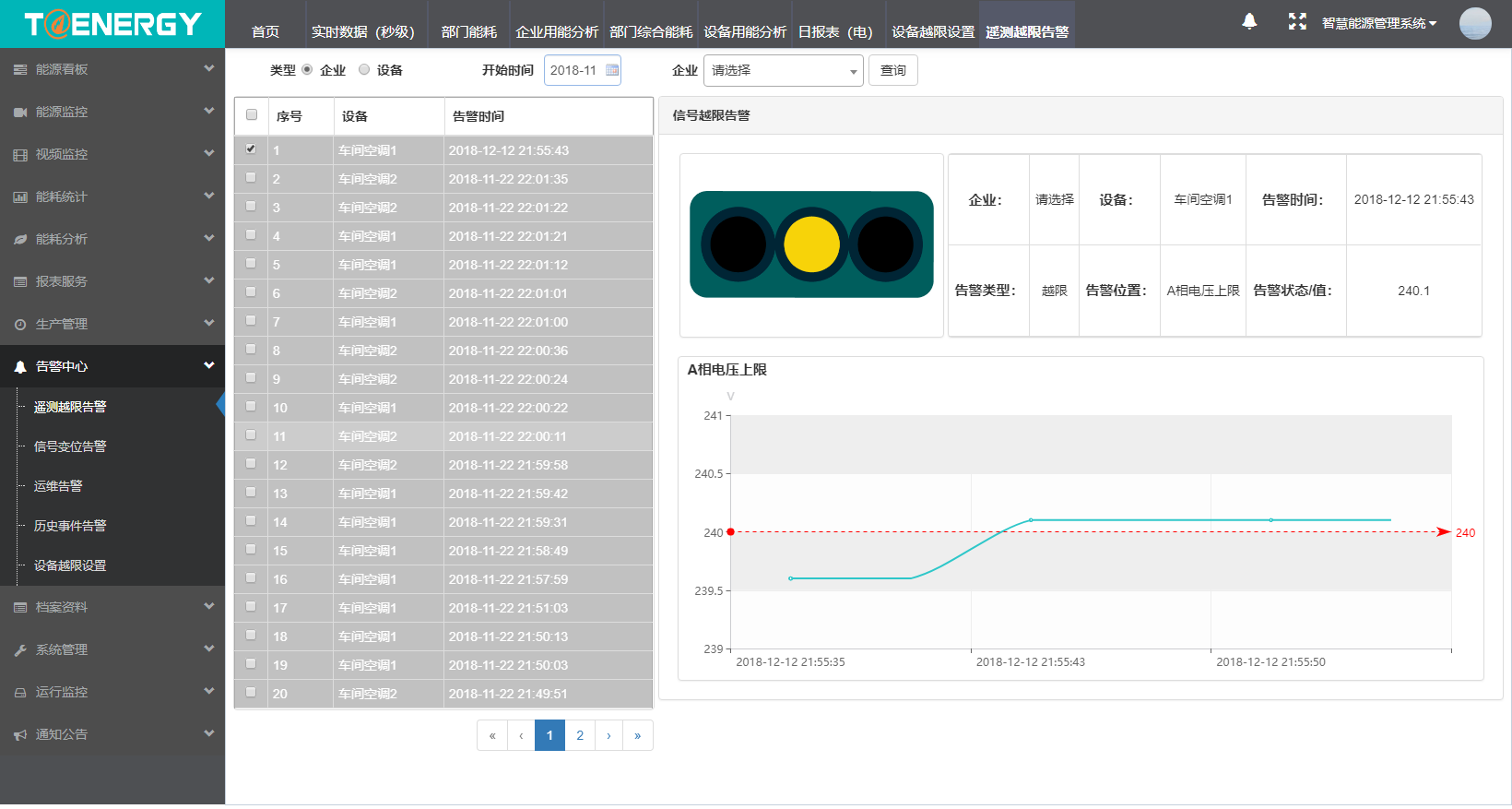 通过设置设备参数的告警阈值,对设备运行状态、能耗情况、故障、预判趋势进行告警提示。