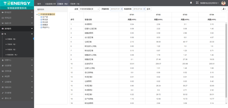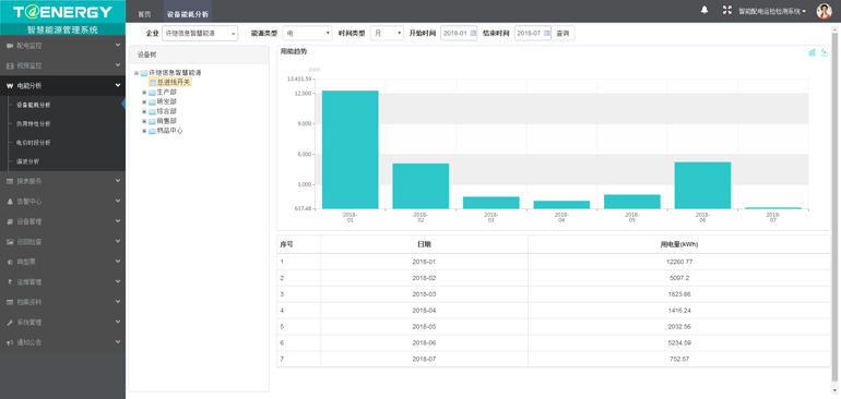 电能分析:能耗分析包括企业用能分析、部门综合能耗、设备用能分析和电量指标综合分析这四类,将企业中各部门及各监测点实际用能情况,通过不同的分析方式展现出来。