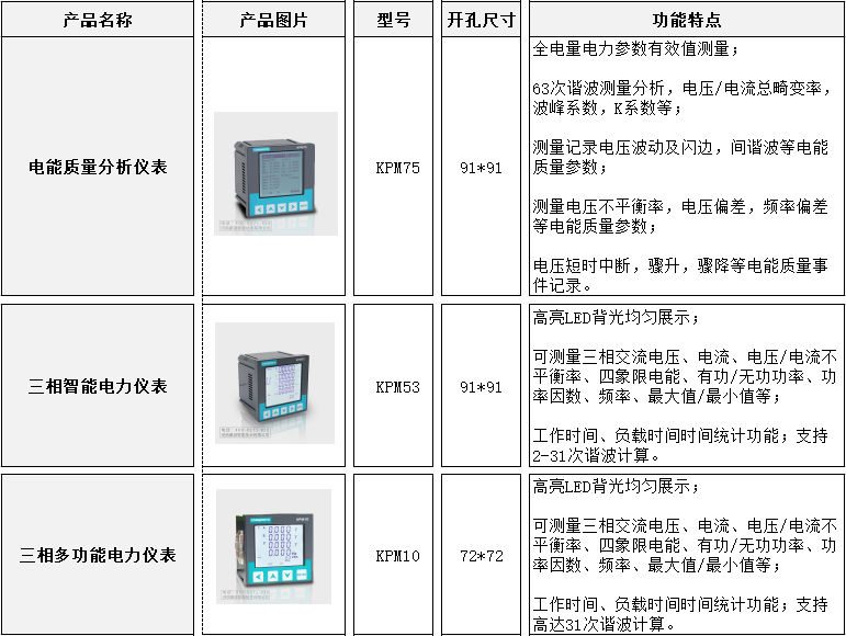 底层智能仪表采用KPM53系列KPM73系列智能仪表。KPM73多功能仪表具有双向四象限电能计量、统计、记录等功能,集三相电参量测量/显示、电能、累计、复费率统计于一体,具有点磁兼容好、LCD液晶大屏幕显示等优点。