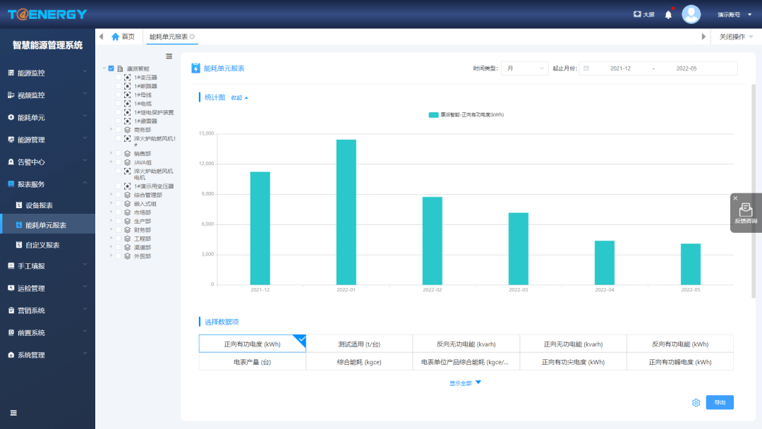 - 展示能耗单元的统计数据、经济数据、运行数据、能耗排名、负荷分析、能效分析、力调分析、分时分析、变损分析、容需分析、碳排放分析等;