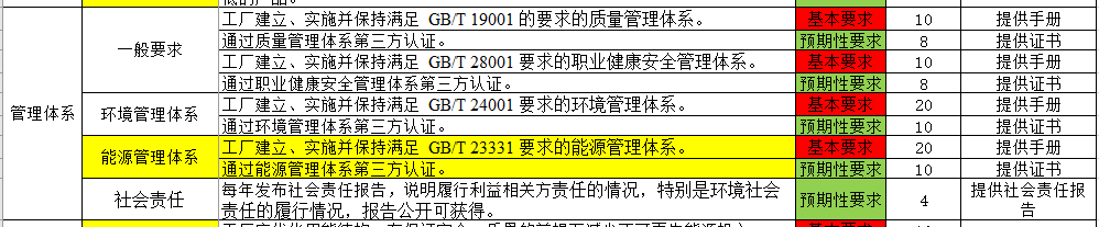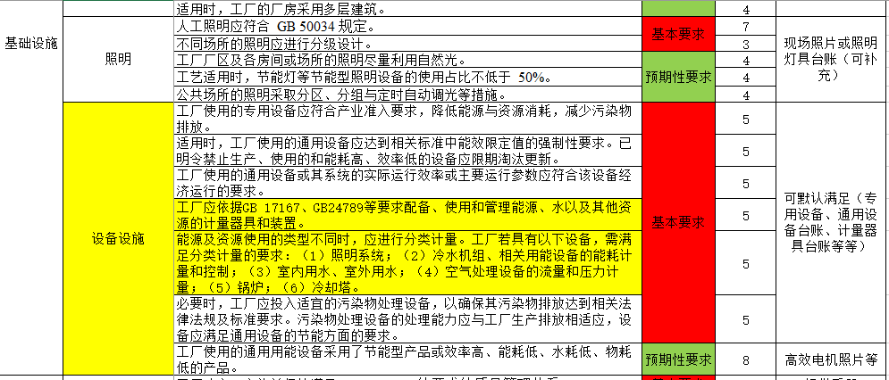 从认证评价表中可以看到与基本要求和预期性要求等相关要求,绿色工厂通过与否,并不是完全看分值的高低,基本要求项都必须满足的基础上再看总分值。其中与能源管理相关的主要有以下几方面的内容: