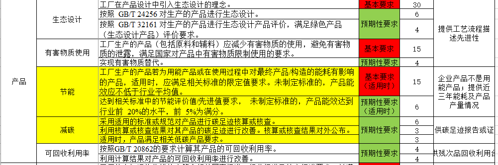 中的附件内容。认证的评价基本也都是按照表单中的各项来执行的,从一级指标可以看到,认证总体从7个维度进行评价,分别是:基本要求、基础设施、管理体系、能源资源投入、产品、环境排放、绩效等。具体不符合条件,以及优化方案可以结合第三方认证公司的要求来确定。市面上常见的第三方认证公司基本都可以做绿色工厂的认证,如果担心不好通过,也可以通过当地工信发布的绿色工厂名单里的第三方认证公司来找合适的认证单位。在当地有案例的第三方认证公司更加熟悉当地的审核流程,通过概率更大一些。
