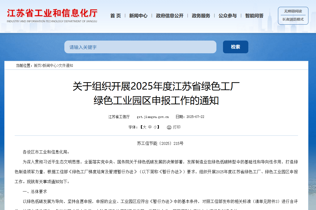 为发挥制造业在绿色低碳转型中的基础性和导向性作用,打造绿色制造领军力量,近日,江苏省工信厅组织开展2025年度江苏省绿色工厂、绿色工业园区申报工作。深入贯彻习近平生态文明思想,全面落实党中央、国务院关于绿色低碳发展的决策部署,发挥制造业在绿色低碳转型中的基础性和导向性作用,打造绿色制造领军力量,根据工信部《绿色工厂梯度培育及管理暂行办法》(以下简称《暂行办法》)要求,组织开展2025年度江苏省绿色工厂、绿色工业园区申报工作。