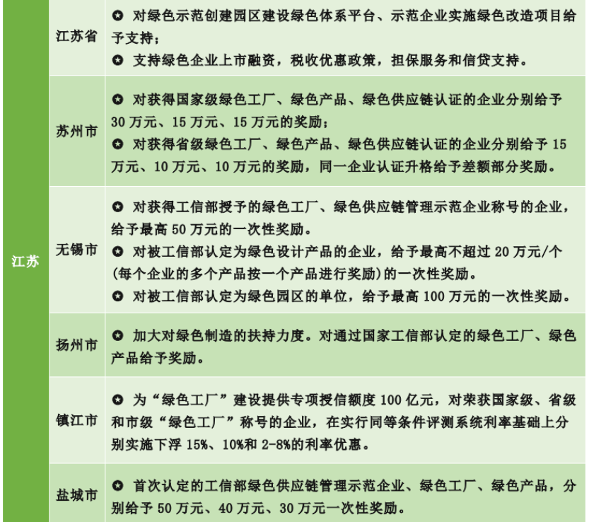 关于绿色工厂,不同的省市都有不同的鼓励性政策补贴,下图江苏省的政策补贴: