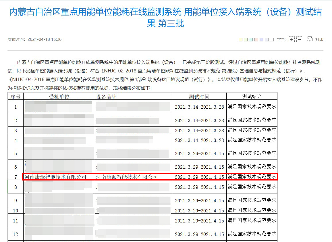 2021年4月18日,内蒙古自治区重点用能单位能耗在线监测系统中的用能单位接入端系统(设备),已通过第三阶段测评。经过内蒙古自治区计量测试研究院测评,云顶国际能耗在线监测端设备符合内蒙古自治区重点用能单位能耗在线监测系统技术要求。公布结果如下图所示: