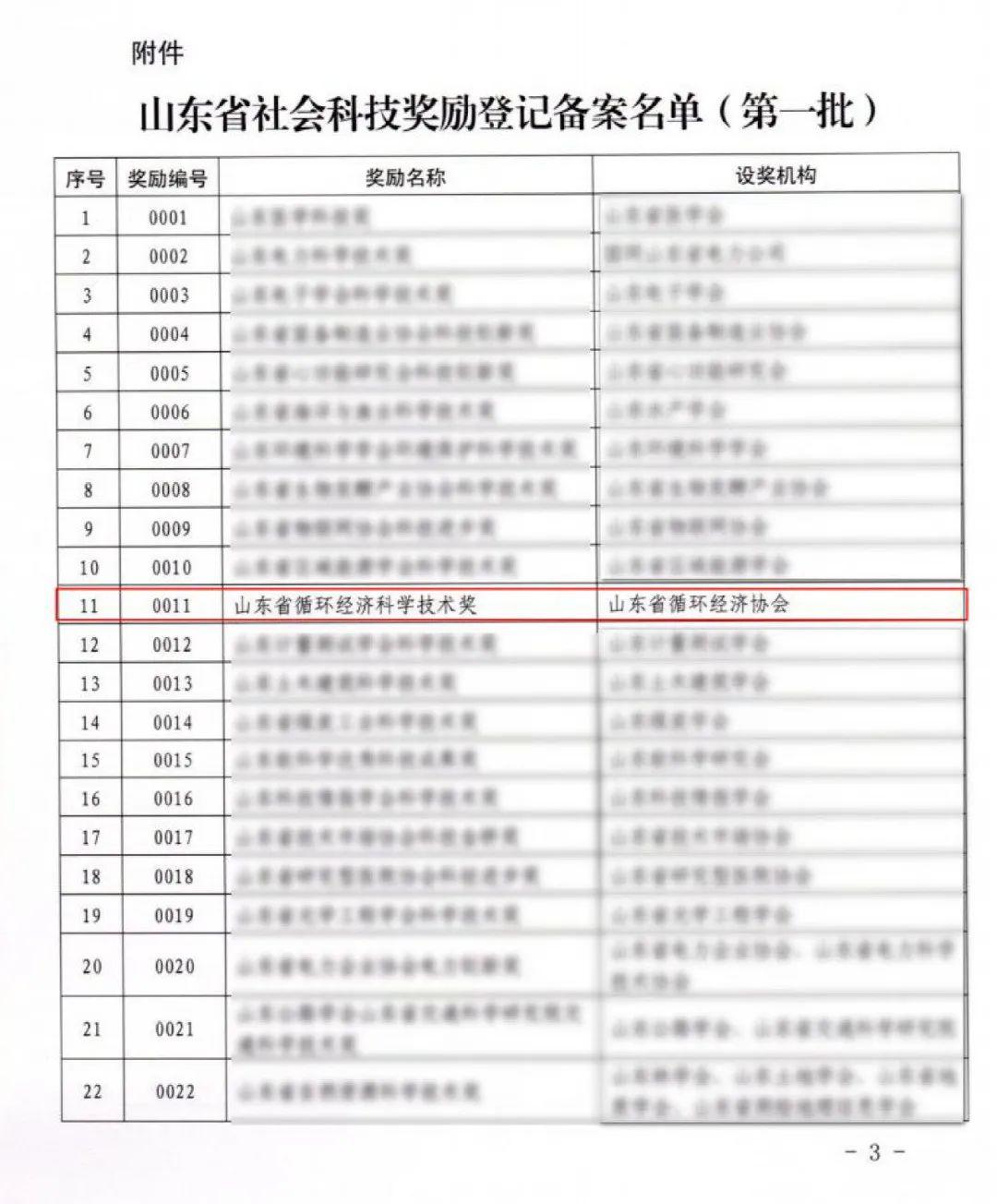 山东省循环经济科学技术奖是为深入贯彻《国务院办公厅关于完善科技成果评价机制的指导意见》(国办发〔2021〕26 号)精神,奖励在山东省绿色低碳循环发展领域做出突出贡献的单位和个人,按照《关于进一步鼓励和规范山东省社会力量设立科学技术奖的指导意见》(鲁科字〔2018〕129 号)有关要求设立的奖项,该奖项列入山东省科学技术厅第一批山东省社会科技奖励登记备案名单。