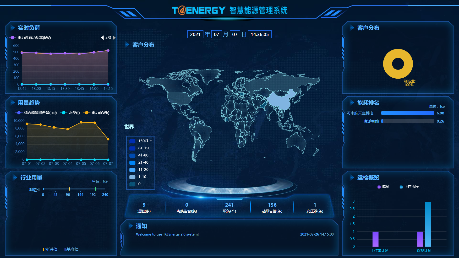 该功能包含对企业的用能分析、部门综合能耗、设备用能分析、电量指标综合分析四个方面,全方位的帮助企业对水、电、气、暖多种能源介质进行统计分析,对比企业能耗情况与同期能耗的差异化情况,了解各个部门的综合能耗情况,细致分析耗能设备的负荷率与耗能情况;并对使用电费的组成情况、电价时段、整体功率因数、设备负荷特性进行分析与展现。T@Energy 智慧能源管理系统的能耗分析功能能够帮助用户快速找到能耗的异常与设备耗能异常,帮助其发现节能空间,为节能方案提供科学的数据支持。